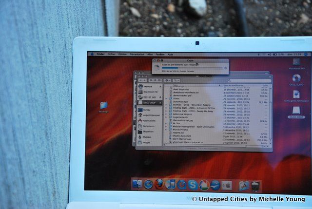 The first Dead Drop in Paris was installed in the Jardin du Carrousel at the start of the Tuileries Gardens just outside the Louvre. The listing on the Dead Drops website warned “gay cruising zone by night” but let me tell you, it was a gay cruising zone by day too. We found the collection of used condoms and torn wrappers (which I affectionately named “Condon Corner” before we found the Dead Drop. But the moment we found it was glorious. It was filled with music, ranging from Beethoven to electro to hip hop, a PDF on how to become a hacker, notes from other excited Dead Droppers, and art. We transfered everything to the Mac, left a love note from Untapped and went to the nearby outdoor Paul café stand to peruse the files in detail.