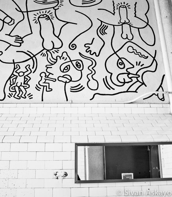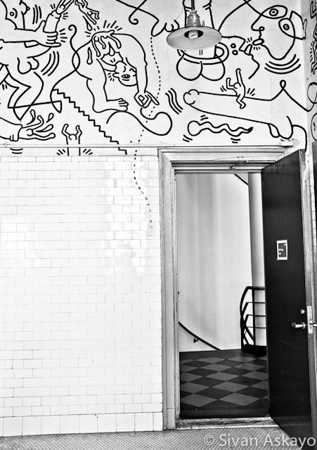 The center was going through major renovation through the years of 1998-2001, when new bathrooms were created and the old bathrooms were re-purposed as meeting rooms, but the ‘Haring Bathroom’ needed a different approach. Can you imagine having a meeting while your background is a penis?