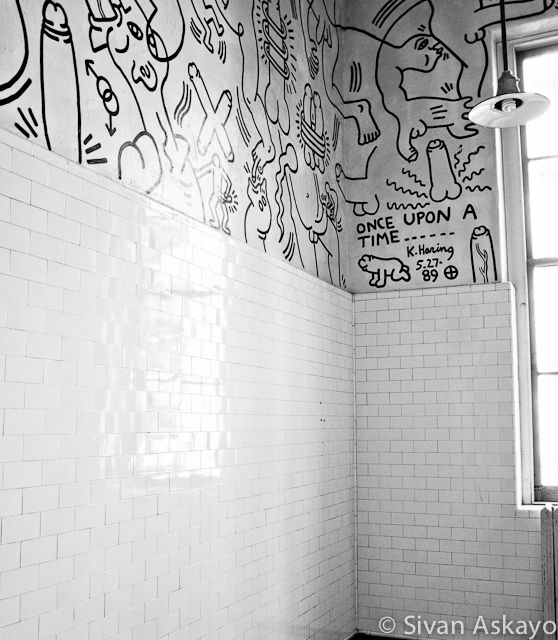 The partitions and toilets were removed but the tile walls and all the old pipes and ducts were left were when Keith originally painted on or around them. Between the years of 1989 and 2011, through normal use, not to mention the major renovation project, the mural acquired a layer of grime and some of the underlying paint started to peel away from the plaster.