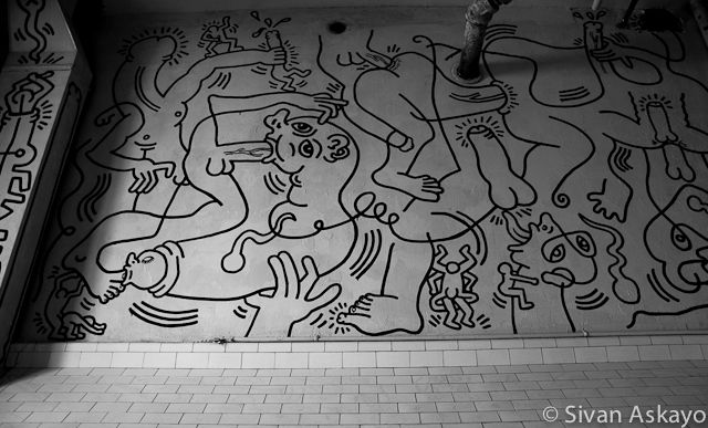The mural entitled Once Upon a Time was painted by Haring in the second floor men’s room. Since the center’s opening on June 1st, 1989, the ‘Haring Bathroom’ as people used to call it, has become, an internationally known tourist destination. The mural was completed only a few months before Haring died of AIDS, making it one of his most personal and resonant expressions.