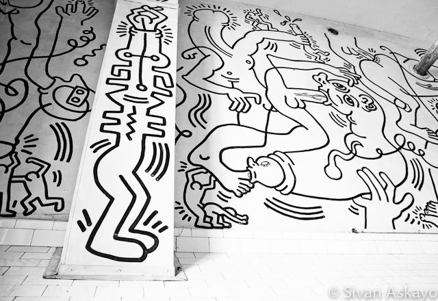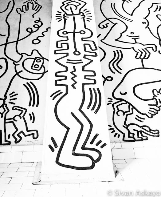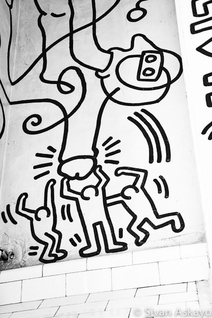 It was time to bring in a professional conservator to clean and stabilize the mural. In October 2011, Harriet Irgang Alden and her colleagues spent three weeks cleaning the entire mural, one square inch at a time, applying stabilizing material where wall paint was separating from plaster and carefully in-filling some of the lines. The mural is part of Keith Haring’s legacy and I think the pictures of it speak louder than words:
