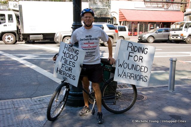 Untapped Cities first discovered Bob Votruba in mid-September while he was on his bike handing out flyers to city goers near the American Museum of National History. The flyers explained that Votruba was in New York City for the summer doing a 4,000-mile bicycle ride for those he calls the real heroes: wounded warriors, policemen, and firefighters. His goal was to visit all 212 firehouses, all 76 police precincts, and various first responder agencies and veterans hospitals in all five boroughs of New York City before leaving in October. This is all part of his “One Million Acts of Kindness” which has evolved from a personal goal to a growing movement.