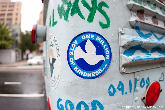 His most memorable tool, however, was parked on an open corner for passersby to see. Painted blue with different motivational quotes and kindness campaigns covering nearly every inch, is the iconic Kindness Bus. From the word “peace” written in 49 different languages on the door, to encouraging sayings covering the windows, everything that Votruba stands for is colorfully written on the bus’s exterior. Painted on the back window is the reason why the mission exists: “Because of Virginia Tech 4-16-07 End All Forms Of Hatred!!”