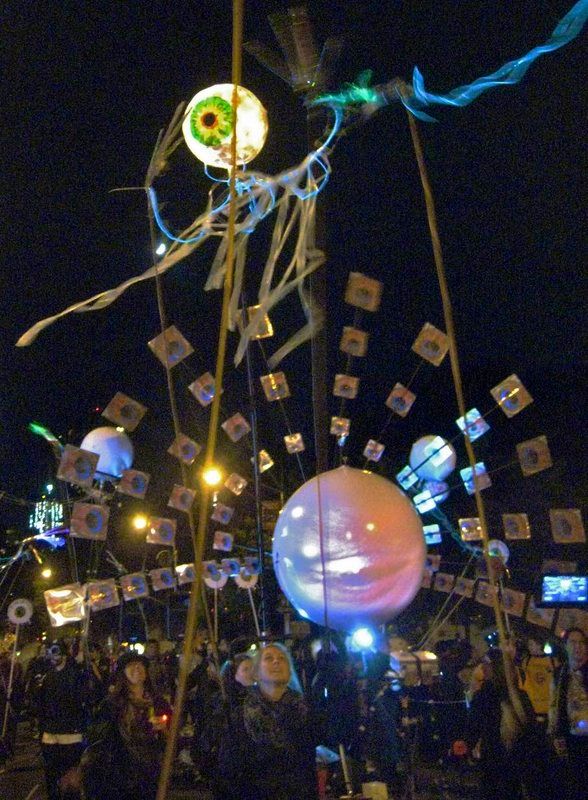 We did a project for the Halloween Parade last year called “Eye of the Beholder” which was a response to the fact that so many people, when they watch the Halloween Parade and other live events, are watching in a mediated form, through a camera or a cell phone. Recording the event is more important than being here now. We thought we would, in a playful sort of way, make a commentary on that by creating a parade of disembodied eyes. We put out a call and we said, “Hey, instead of recording us, why don’t you record yourself? Send us a video, a close-up, of one eye. Just your eyeball filling the screen. Send it to us, we’ll stitch them all together in final cut, and then when we do the parade we’ll project those eyes as one ever-changing continuum of oculi.” We got tons of videos from people, both local and over the web, and stitched them into a film, and then we used those tiny projectors that we used at the PEN World Voices Festival to actually project people’s eyes onto puppets in motion. We were literally reversing the gaze; we were staring back at you, with your own eye.