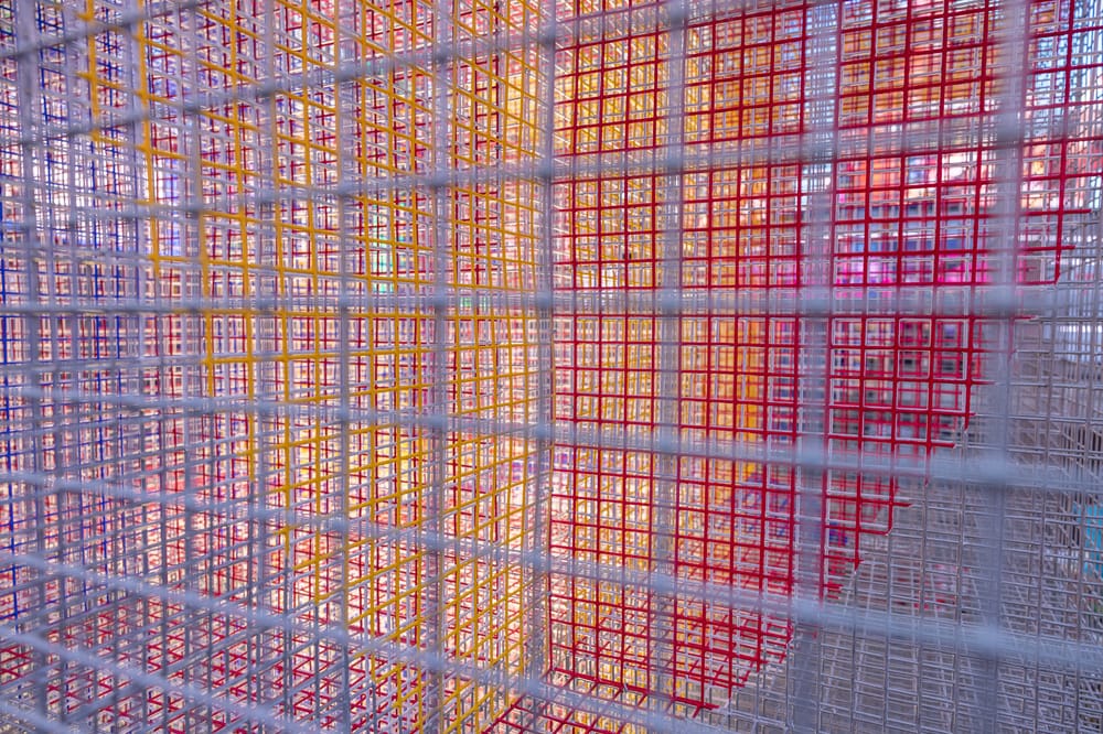 After its installation in Times Square, the metal mesh used in the sculpture will be placed in New York Harbor to create oyster research stations. To ensure that the materials won't harm maritime wildlife, kt.COLOR created new paints, especially for this project, without harmful ingredients. One oyster cage filled with shells positioned next to the sculpture shows how the cages in the installation will be used.