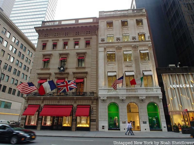 George W. Vanderbilt purchased the land right by where the Triple Palace was and built his “Marble Twins” at 645 and 647 Fifth Avenue between 1902 and 1905. Designed by Hunt & Hunt and completed in 1905, the homes were built in the French Renaissance Revival style. The Vanderbilt mansion at 645 was demolished, but 647 still remains. 647, otherwise known as the George W. Vanderbilt Residence, is a six-story stone building whose first floor features arched openings topped by a balustrade. George rented 647 to Robert Wilson Goelet, a prominent real estate developer and banker. George passed away in 1914, and 647 was altered for commercial use in 1916 and eventually contained an art gallery and airline ticket agent. Now, the building is occupied by a Versace store.
