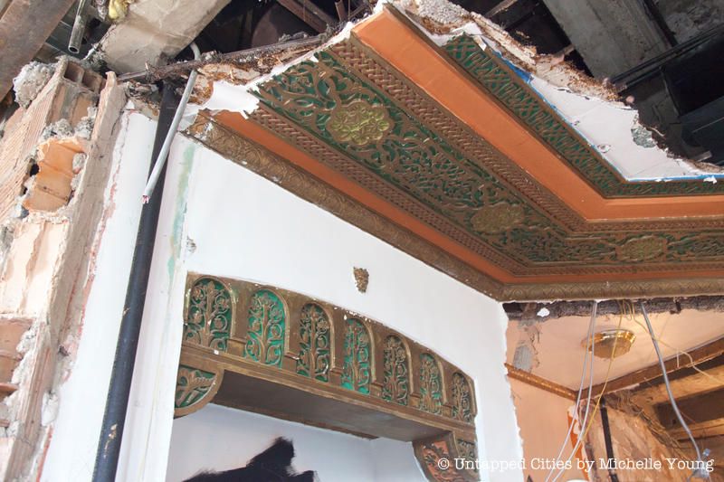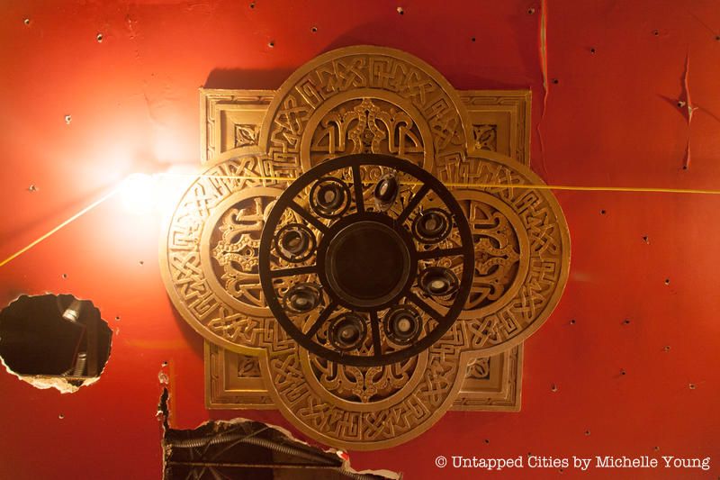 Viragh has been inviting local residents and press to see The Pavilion in its current state, as renovation begins in earnest for a projected spring 2018 opening. “We pride ourselves on being a neighborhood theater,” he tells us, and wants people to “see what’s here. We’re going to move fast.” His team will retain the few original elements of the theater still present, including ceiling medallions around the light fixtures, decorative balconies, the curves of a former VIP lounge, and Moorish Alhambra-esque plaster details in the lobby and lounge areas. A walkthrough today also reveals the original stage and stadium seating, as well as the number of smaller theaters that were configured over the years. The two marble staircases from the lobby will also remain, though currently, the natural material is quite hidden under layers of glue and tattered carpet strands.