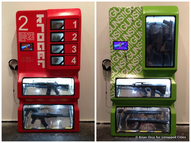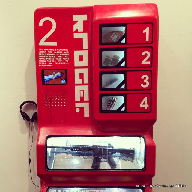 On the wall are 5-foot long, stylized versions of old-school zip guns that bear a slight resemblance to the artillery in the Japanese animated film Princess Mononoke. The centerpieces, though, are in the back of the gallery. Two vending machines from the fictional company “KROGER” that sell machine guns, cheap screw-top liquor and cigarettes. A scantily clad woman pitches the wares on a screen playing a loop of a terrestrial analog broadcast style infomercial exhorting the consumer to buy into the promise of empowerment through violence.