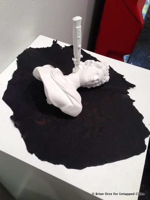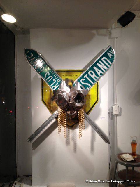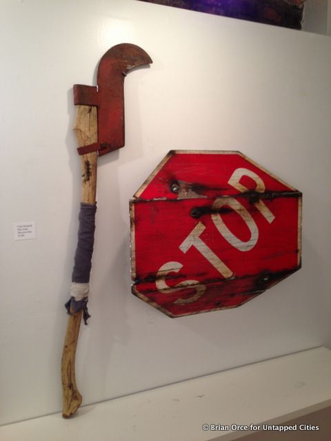 In the window of the Superchief Gallery at Culturefix on the Lower East Side of Manhattan hangs a Marcus Garvey Boulevard / Nostrand Avenue coat of arms welded and cut by Coby Kennedy, one of the three Pratt-educated artists in this week’s BLACK POWER art show. Kennedy’s art comments on cultural diffusion and power dynamics through the lens of a dystopian Brooklyn 400 years in the future with only passing stylistic similarities from post-apocalyptic films like Road Warrior. He found an outlet for fascination with the ways in which cultural expectations can be manipulated as a graffiti writer in Washington, DC with the Dot-Com crew where he would carry out his missions carrying his spray cans in a briefcase instead of a backpack and wearing collared shirts and blazers instead of the graffiti writer uniform of baggy pants and hoodie.