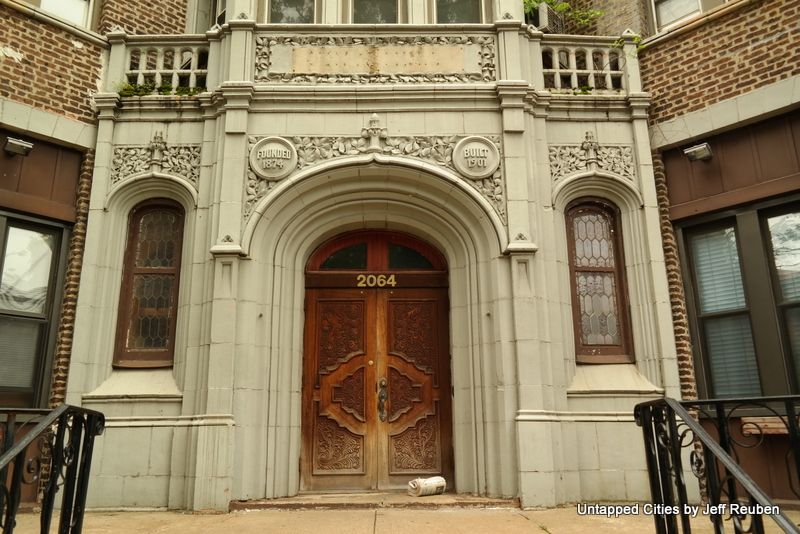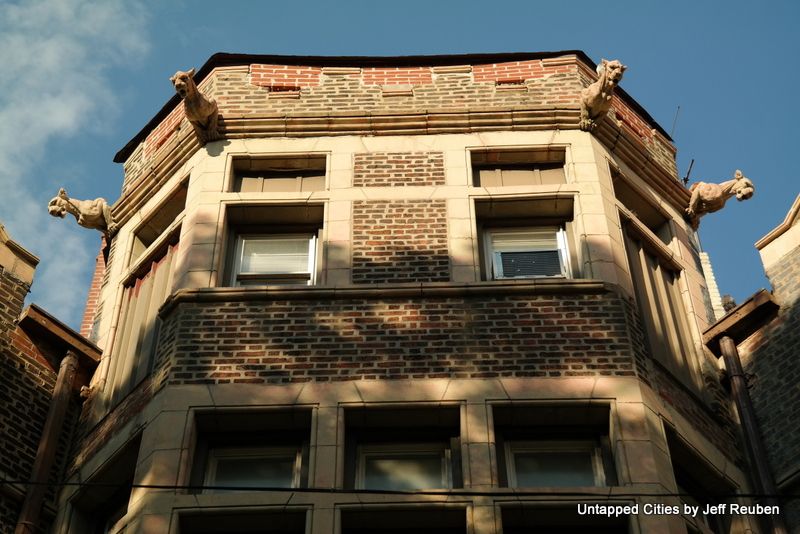 The exterior has several notable decorative elements, including four dog gargoyles standing guard along the front roof. Circular tablets above the arched doorway with raised lettering provide a quick history lesson: “Founded in 1874” (in Manhattan) on the left and “Built 1901” (though not finished until the following year) on the right. It was designed by British-American architect Edward A. Sargent.