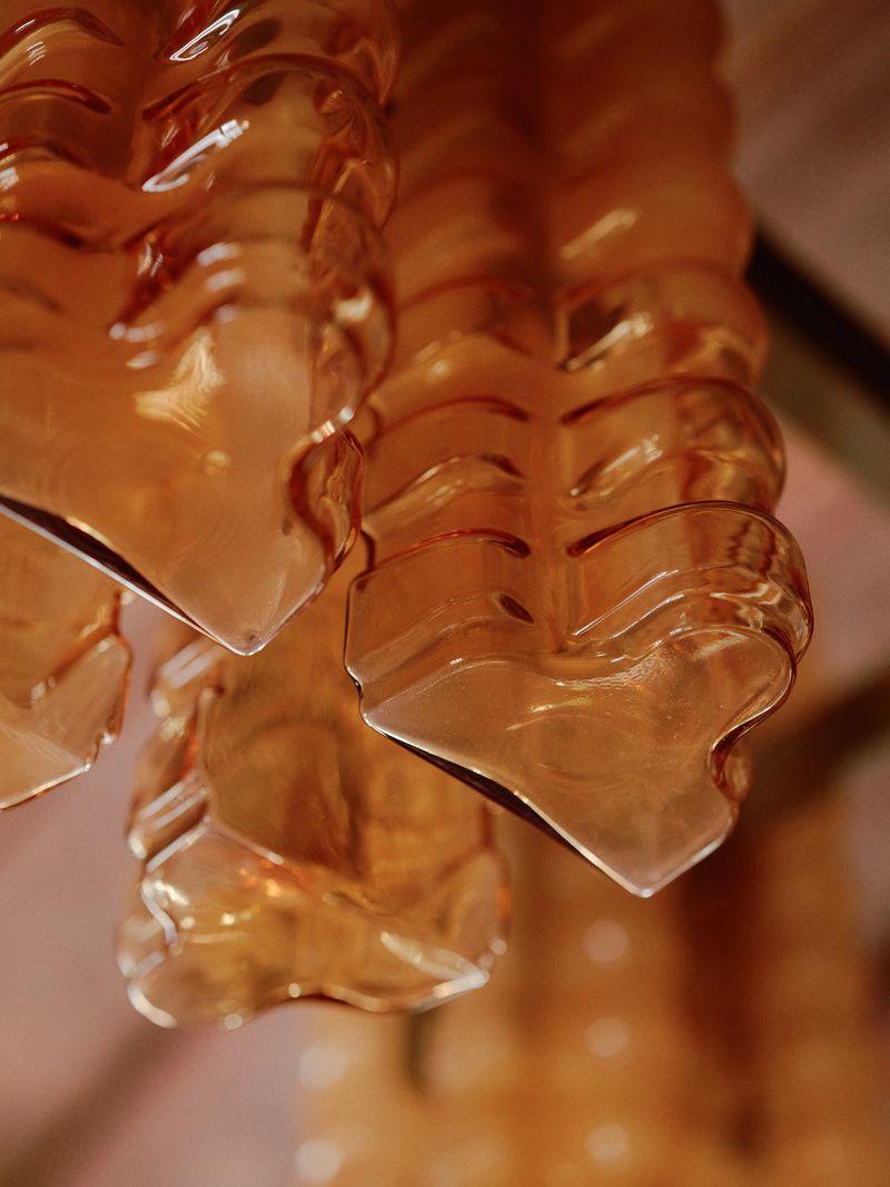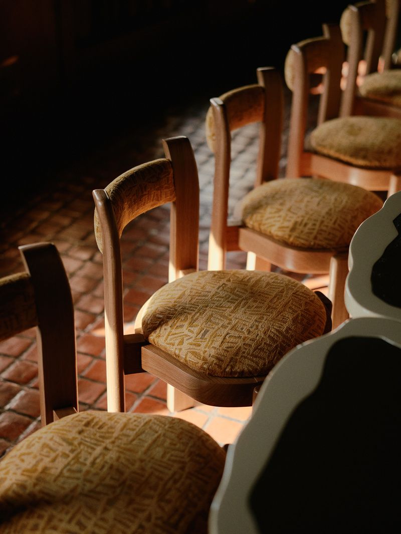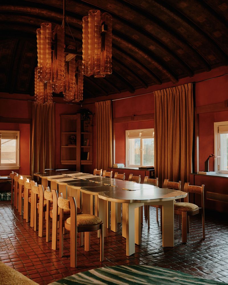Inside, the space is covered in warm natural tones of green, brown, gold, and red, mirroring the colors of the neighboring park. New bespoke pieces of furniture, such as the interlocking tables and oak chairs designed by Toro and crafted by Atelier Boutin, sit in harmony with the historic architectural details of the room, like the vaulted wooden ceiling. Hanging from that ceiling is a handblown glass chandelier designed specifically for the space.