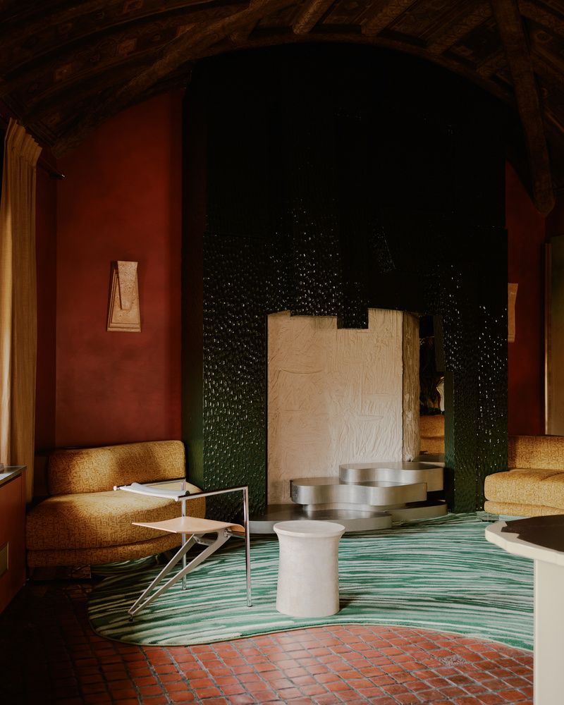 Historic elements of the space were expertly restored by Cinzia Pasquali, founder of Atelier Arcanes. Some of the items in the room that Pasquali worked on include Renaissance-inspired painting decorations on the studio’s vaulted ceiling and the glazed brick-colored terra cotta tiles on the floor. Called “tommettes de Provence,” the tiles are a glazed terra cotta made by Spanish architect Rafael Guastavino, whose work appears in many late 19th and early 20th century New York City buildings. Parts of the floor are covered by a custom-made rug by Maison Pinton, designed by Toro.
