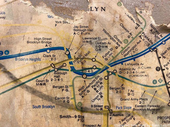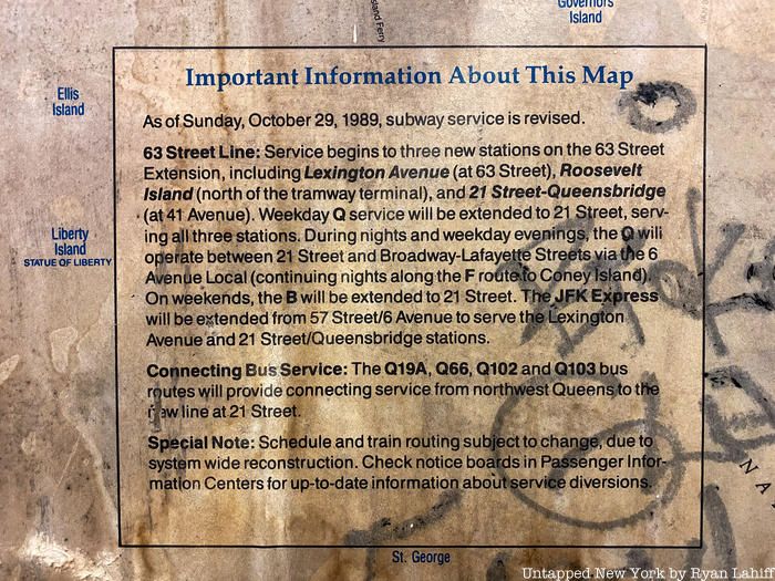 A vintage 1989 subway map has been unearthed and spotted at Manhattan’s Houston Street station on the 1 line. What makes this discovery even more fun is that the map contains a service note from this day, October 29th! The New York City subway map is an ever-evolving wayfinding tool and piece of graphic design, so it is exciting to compare today’s map to those of the past. The discovery of this 1989 subway map, which was spotted and photographed by photographer Ryan Lahiff, brings back the thrill of finding a 1970s Vignelli designed by that was uncovered a few years ago.