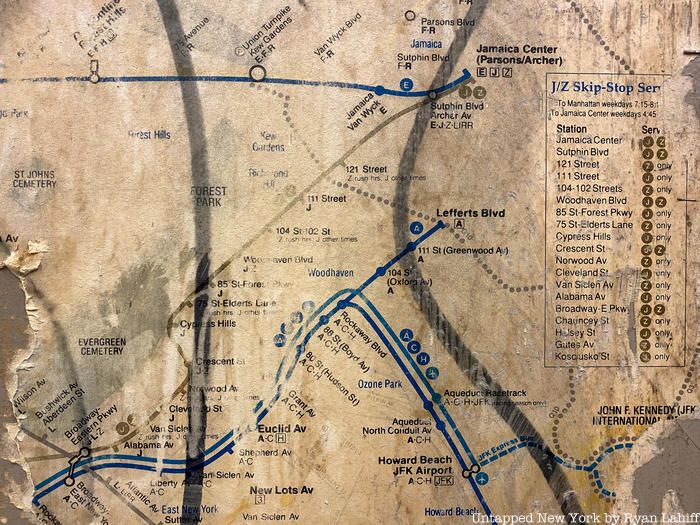 In the photo above, you can see little airplane symbols that denote the JFK Express, a train that took passengers from midtown Manhattan to JFK Airport. The “Train to the Plane” started at 57th Street and 6th Avenue and terminated at the Howard Beach-JFK Airport stop where an express bus would take passengers to their terminal. On the map, the route is light blue. Also in the photo above, you will see a number that we don’t use anymore, 9. The colors on the map have faded to yellow, but the 1-9 was the Broadway-7th Avenue local of today’s red 1,2,3 line. The 9 was suspended in 2005.