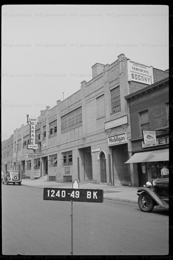 Down the street less than two blocks away from Auto Baby Sitters is the gem of Automobile Row: the Studebaker Building. The landmarked building was built in a neo-Gothic style out of concrete and brick, with a white terra cotta facade. Along the parapets at the top of the building, you can still find the wheel logo of the Studebaker company. The front facade, which once had large windows to showcase cars, has been altered significantly and the building was converted into apartments for low-income, disabled, and homeless families. The building that Auto Baby Sitters is in is nearly a hundred years old and if you look closely, you’ll see some of the etchings common to the auto industry—a wheel with wings. In the 1940s, as you can see in the New York City Municipal Archives tax photographs, the garage was called the Savoy.