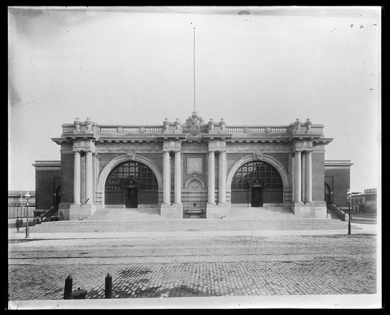 The public bathhouse in Greenpoint on the corner of Metropolitan Avenue and Bedford Avenue was constructed in 1922 on the lot where an old Civil War armory once stood. Although the bathhouse is no longer operational, the building still stands today as Metropolitan Pool. Image via New York Public Library Digital Collections.