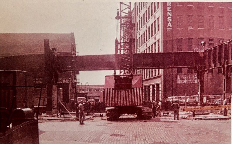 High Line Demolition- crane with wrecking ball mounted on the trestle. Photo by Peter H. Fritsch (1962). Photo courtesy of the Greenwich Village Society for Historic Preservation/Fritsch Family Collection.