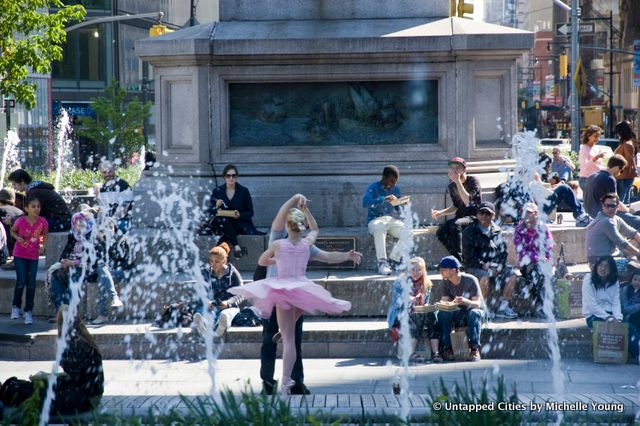 The Charles Fazzino The Ride goes past Columbus Circle, featuring ballet dancers amidst residents and visitors taking time in Columbus Circle