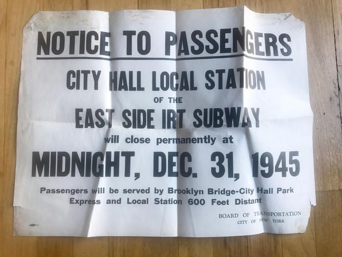 The notice above, from the Board of Transportation in 1945, announces City Hall Station’s closure. The sign directs subway riders to use the express and local station at Brooklyn Bridge-City Hall Park, just 600 feet away, for future travel. City Hall Station was decommissioned in 1945 due to a decrease in ridership and because new, longer subway cars could not stop at its curved platform. Though perhaps the most famous, City Hall is just one of many subway stations that have been abandoned over the system’s more than one-hundred years in operation.