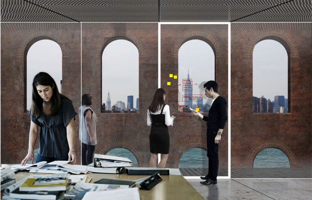 Interior office space in the Domino Sugar Factory. Rendering courtesy of Practice for Architecture and Urbanism.