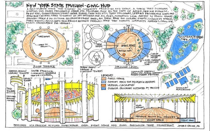 Queens Borough President, Melinda Katz, sponsored the ideas competition, which advocated an “anything goes” criteria. Judges included noted architecture critic Paul Goldberger, who said “The outpouring of new ideas for its re-use not only shows how beloved this structure is, it gives me confidence that this great building can have a future that will be as meaningful as its past.”