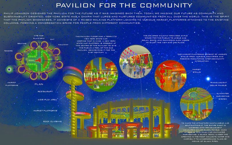 The third prize plan “Pavilion for the Community,” by Rishi Kejrewal and Shaurya Sharma also focuses on the surrounding neighborhoods, creating a “cultural marketplace” that focuses on sustainability, diversity and education. This proposal aims to keep the terrazzo floor map of the State of New York, adding elevated platforms around the pillars of the structure. These platforms would host market stalls from different cultures and countries, “facilitating inter-comunity interaction.” The structure would be powered by translucent solar panels and a rainwater harvesting system would be installed on the roof, bringing water down through glass pipes. The towers would host a playground, restaurant and more markets.