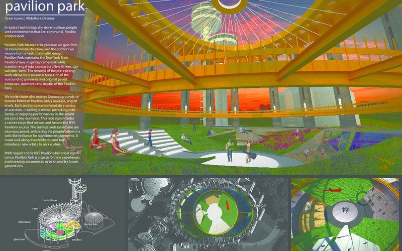 Pavilion Park is a project designed by Queens residents Cesar Juarez and Alida Rose Delaney, using technology as a starting point for new design. They write that “in today’s technologically-driven culture, people seek environments that are communal, flexible and personal.” They want the New York State Pavilion to be a place that New Yorkers “can call their own.” To do this, they propose the removal of the existing walls to open up the space, bringing greenery in through angled levels that can accommodate different types of activities and a center stage area.. A mural wall would be added to feature new artists