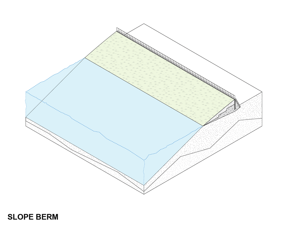 As explored previously, one of the pressing urban issues facing the context of Rikers Island is the poor state of preparedness in the case of severe flooding such as during Hurricane Sandy in 2012. Part of the New Rikers proposal explores the potential of the strategic reuse of the subtracted matter from Rikers Island into berms for protection against floods. Adding berms to floodwalls can increase their effectiveness as the mass of material, in this case soil, can help absorb some of the inundation.