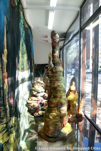 In the front window of the gallery sits Unconformity, Joianne Bittle’s interpretation of Plato’s cave with some stalagmites and stalactites posed in front of a mirror so when visitors walk in they see themselves reflected in this prehistoric scene. Bittle is a professional dioramist for the American Museum of Natural History, and her fascination with nature’s more colorful and chaotic forms is evident in her paintings as well as the installation. Unfortunately, the day of the tour was the last day of the exhibition, but you can learn more about Bittle on her website.