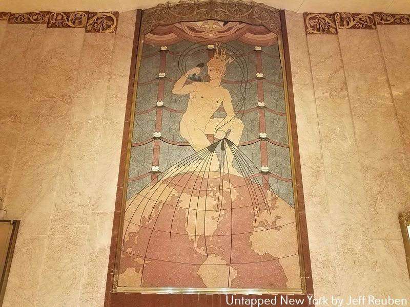 Inside, at the far end of the lobby, which is fitted with marble walls, terrazzo flooring, decorative plaster, and multi-planar ceiling, there is a second commissioned artwork. As shown in the photo below, here one finds a terrazzo mural “which represents,” in Walker’s words, “man’s control of world-wide communication.” It was designed by German-American painter Alfred E. Floegel and executed by L. Del Turco & Brothers, a firm still operating in Newark.