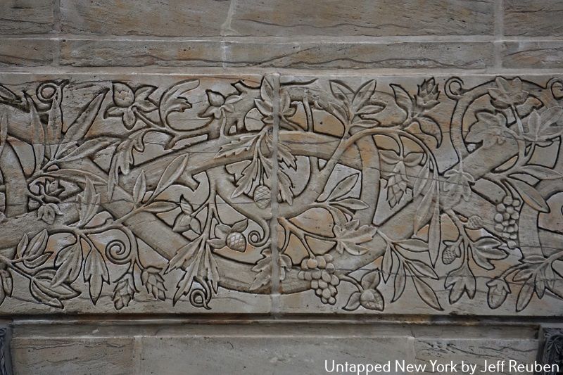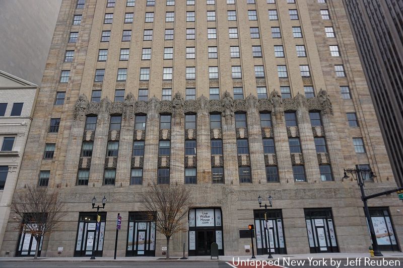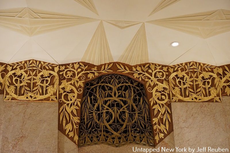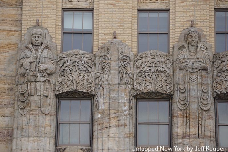 Besides these signature artworks, the building also features elegant Art Deco detailing at high visibility points. On the exterior, bas-reliefs with floral, vegetative, and geometric themes are applied around the entrances, on a frieze above the first floor, in spaces connecting the McCartan sculptures, at setbacks, and along the roofline. They bear a strong resemblance to those found on the Barclay-Vesey Building, which is not surprising given that architectural sculptor John De Cesare worked on both buildings.