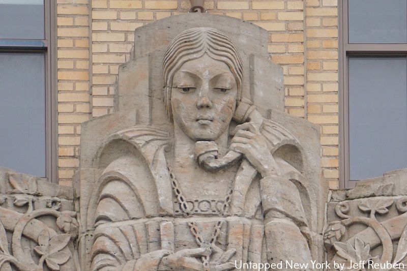 As shown in the photos above and below, artist Edward McCartan created six sculptures facing the park that depict telephone company employees and customers. As Walker put it, they “were made to compose with the classical facades of the Library and Museum and the Globe Indemnity Insurance Building, establishing a monumental line about the park.” McCartan, who around the same time designed the clock and allegorical statues of the New York Central Building on Park Avenue, gave his contemporary subjects a look suggestive of Athenian antecedents.