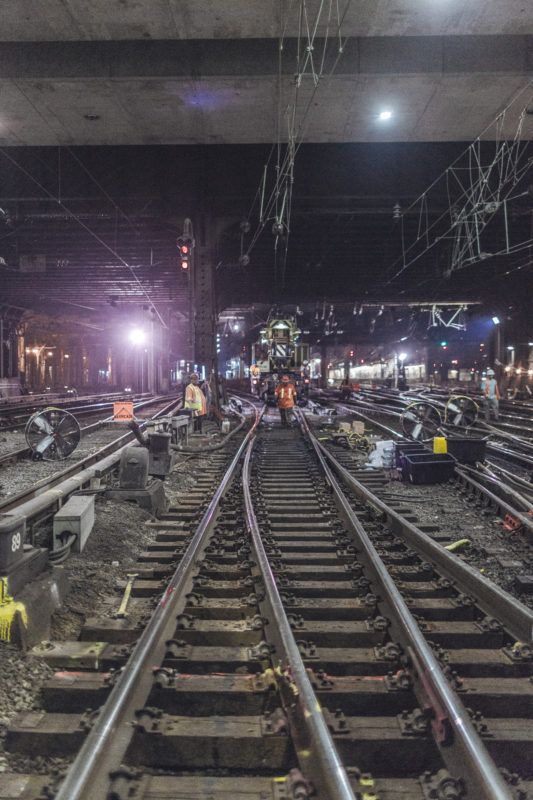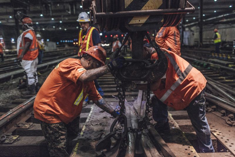 The video is not only exciting for New Yorkers whose commutes are affected by Penn Station’s infrastructure renewal project, but anyone who has always wanted a behind-the-scenes glimpse at what goes on during track work in general. The video shows Amtrak employees moving from place to place, laying down new track infrastructure and moving giant equipment, as cranes lift panels weighing tons and trains zoom by in the background. The neon orange of their uniforms combines with the dark colors and bright lights of the surrounding track to create quite surreal images.