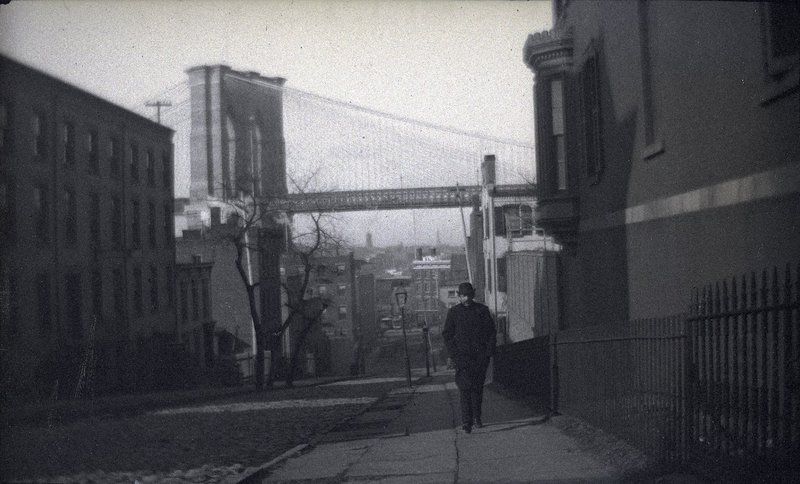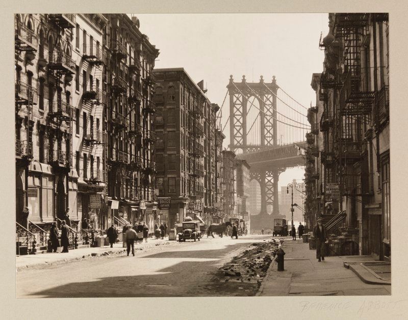 Pike Street between Henry and Madison Streets, showing tenements with the Manhattan Bridge in the background. Photo from Museum of the City of New York