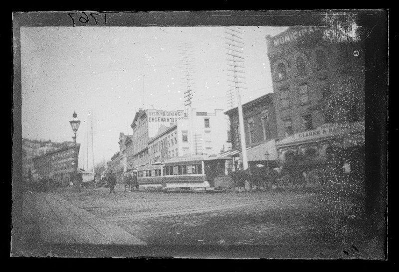 The corner of Broadway and 38th Street. Pedestrians and a street lamp are visible. Photo from The Museum of the City of New York