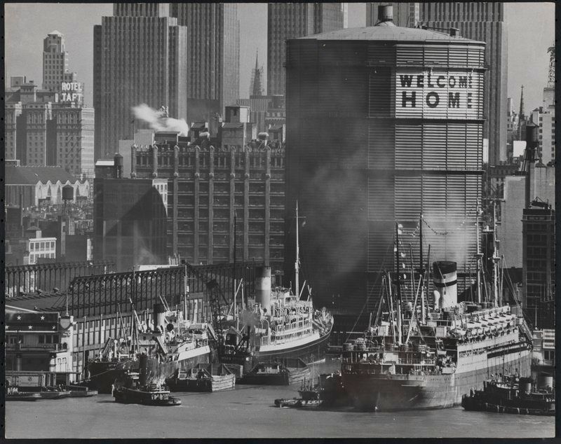 View of the contrast of 19th century dockside buildings and 20th century skyscrapers taken from Pier 11 on the East River, between Old Slip and Wall Street. The four tallest buildings are (from left to right): The Farmers Trust Building, the Bank of Manhattan, 60 Wall Tower, and 120 Wall Street. Photo from The Museum of the City of New York.