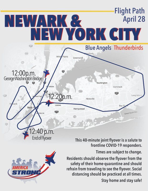 The U.S. Navy says that residents can see the flyover from the safety of their homes, and should not travel to landmarks, hospitals or gather in large groups to view it. They encourage residents to tag the flyover on social media with the hastag #AmericaStrong.