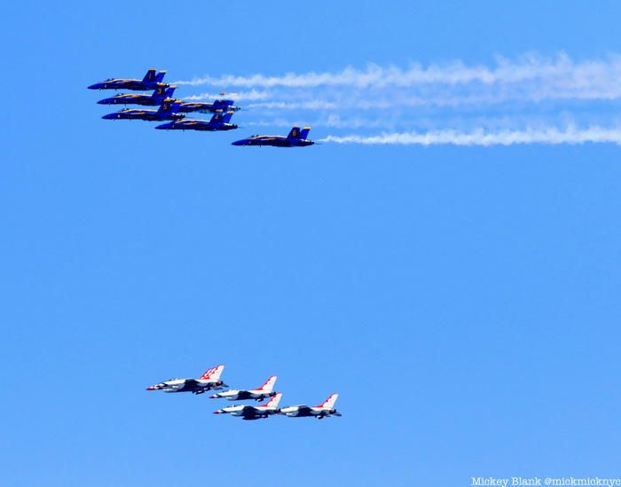 Starting at noon today, the U.S. Air Force Air Demonstration Squadron, the Thunderbirds, and the U.S. Navy Flight Demonstration Squadron, the Blue Angels, will fly over New York City and Newark to honor frontline COVID-19 responders and essential workers. In the map below, you can see the planned path so you can come out to greet the formation of twelve six F-16C/D Fighting Flacon and six F-18C/D Hornet aircraft that will fly overhead as “collaborative salute.” The New York City flight will last about 35 minutes in total. [This post has been updated with video and photos from the event].