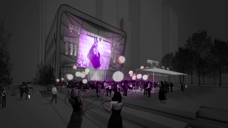 From the ground up, watch the Shed gradually being built piece by piece, with trucks moving equipment in and out of the area. The video then shows renderings of the Shed in action, from the moment it emerges from the adjacent building to after its completion, hosting different artistic performances with flashing lights and crowds making it realistic.