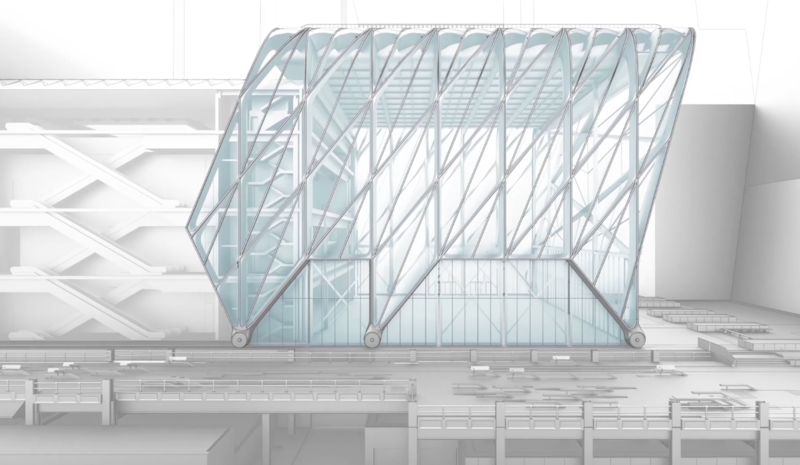 The animations below show the Shed springing out of its partnering skyscraper, gliding smoothly along its wheels in the backdrop of construction and busy streets. The animations offers unique views of the Shed’s movement—under, above, and from the side. You can almost envision the Shed moving along the same path after its completion, sleek, white, and modern.