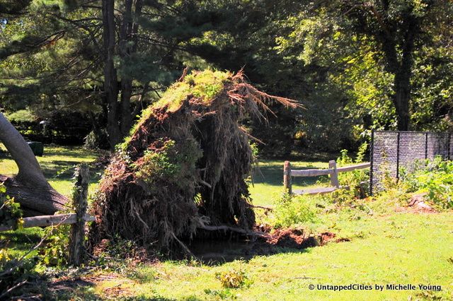 On Saturday night, the fire trucks had circled our neighborhood–a peninsula on Long Island sound called Strong’s Neck–telling us of mandatory evacuation. We live on a hill and my father staunchly refused to leave, as my mother yelled and tried to find a hotel–and I continued following Twitter reports of the storm. By morning, the damage was obvious. Strong’s Neck was now Strong Island, the one access road flooded. Some of the trees are probably several hundred years old and did not stand up to the test of Irene, one crashing through the roof of a neighbor and more falling onto power lines. We did lose electricity near the tail end of the storm and now at mid-afternoon Monday there is no sign of its return.