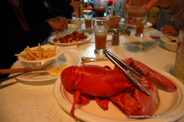 Today, we headed to one of our favorite dives–the Tara Inn–for their “Hurricane Lobster Special.” This place has everything you could need and it stayed open all through the storm–a long Irish bar with cheap drinks, scratch-off drink prizes, Erotic Photohunt and arcade games, and a Stimulus Menu that includes burgers, french fries and beer from $1.00-$1.50. They used to have a $9.99 lobster special that came with soup, salad and fries but it seems the recession hit them too. And like the neighborhood joint where everyone knows your name, sitting at the bar were two of my dad’s patients. One he had saved by sending her for a full heart transplant.
