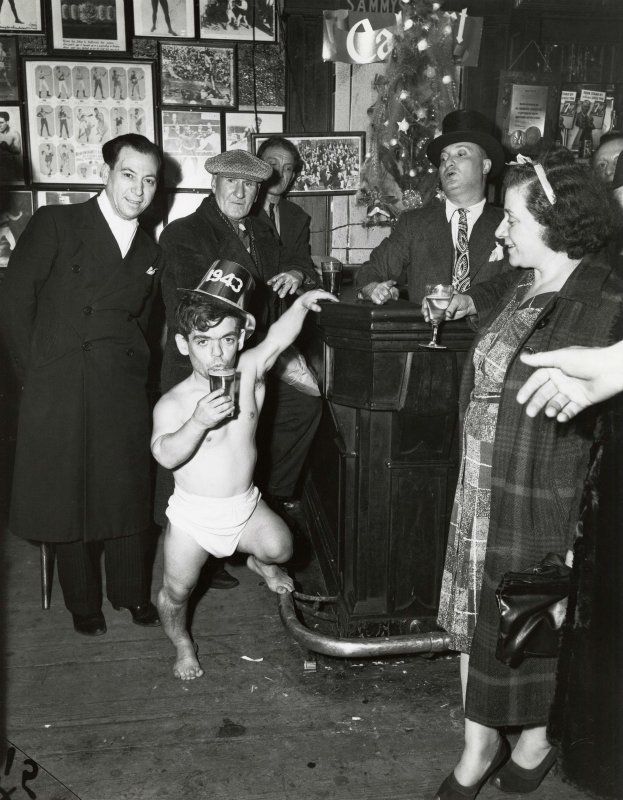 Shorty, the Bowery Cherub, New Year’s Eve at Sammy’s Bar, New York, 1943, © Weegee / International Center of Photography.