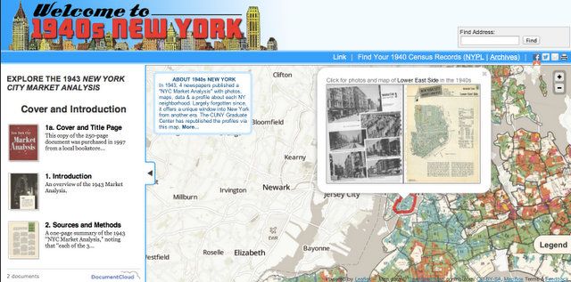 Steven Romalewski, director of City University of New York’s Urban Mapping Service, told us that he had come across the book by chance at the New York Bound Bookstore when it was going out of business in 1997, and then waited for the actual responses to the 1940 Census to be released to the public in 2010. The interactive map (which works on Safari and Firefox, but not Chrome) mixes vintage photos with demographic data. The website also shows demographic changes between 1940 and 2010. The entire book is scanned, and when you click on a neighborhood, the spread in the book shows up.