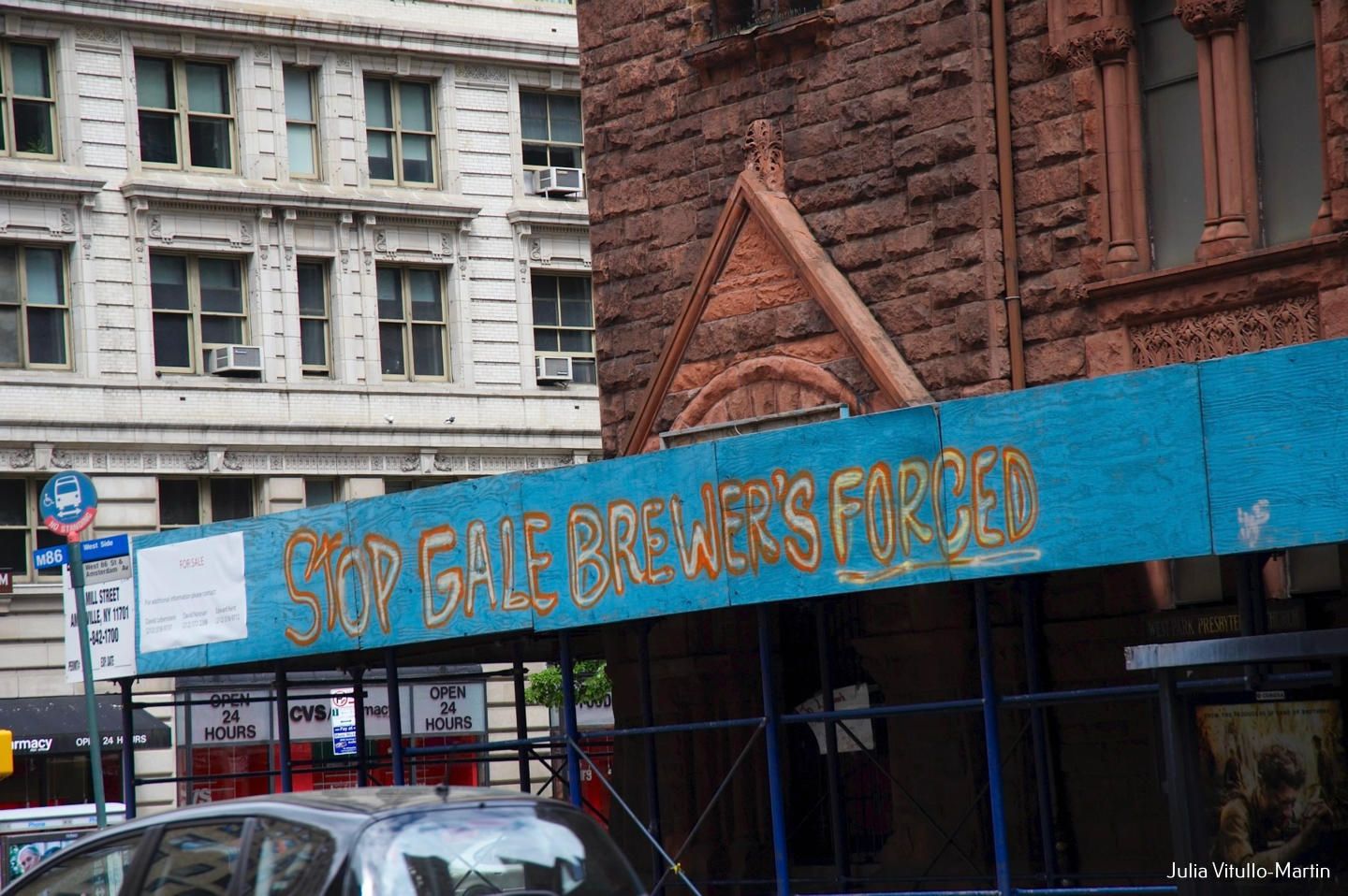 Some congregants, such as West Park elder Hugo Meneses, concluded that talk was not enough. He was arrested by police during an April 2010 protest while he tried to paint “Stop Gale Brewer’s Forced Landmarking” on the sidewalk scaffolding. “The concept of forced landmarking is unconstitutional,” he told a Presbyterian Church publication. “The so-called preservationist groups have little care about the effects landmarking would have on the congregation or the church itself. Their only concern is trying to preserve the building without making any effort to help financially. They have been trying for 25 years to have this church landmarked. They make big promises, but they are empty promises. How much money have they raised or given to help restore the church over the last 25 years? None.”