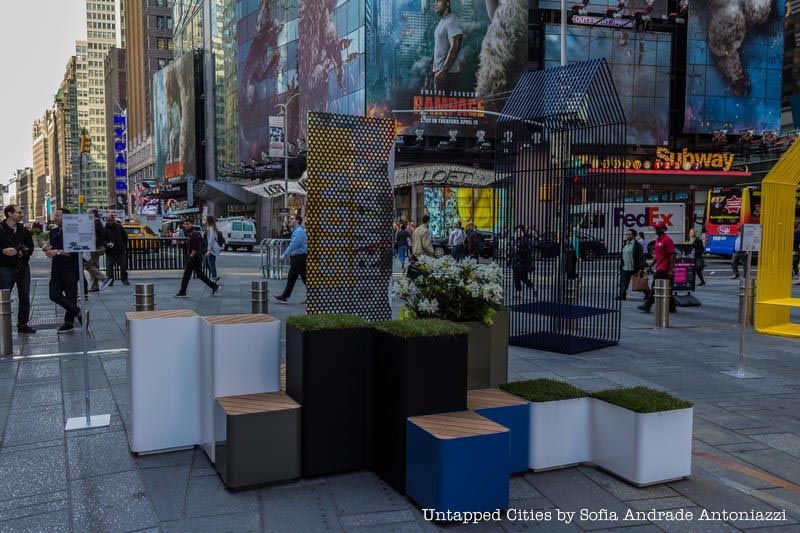 For the first year, the Times Square Alliance is showcasing prototypes developed through the Times Square Design Lab, which commissions proposals to enhance public space from New York City designers. This includes a tear drop-shaped signage system by Louis Lim, Island Collection, a seating concept by Brad Ascalon, and Title Wave, a curvilinear bookcase and seating option by Hive Public Space.