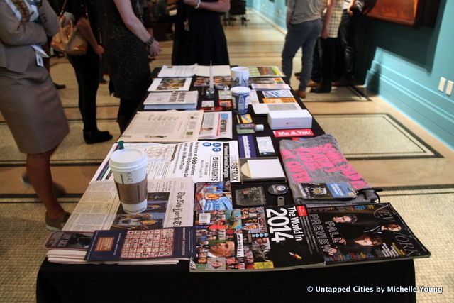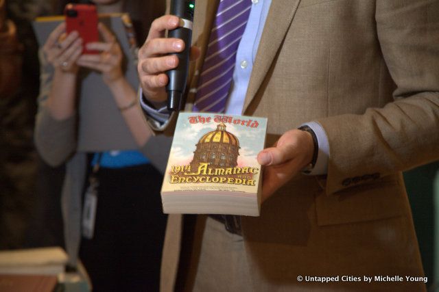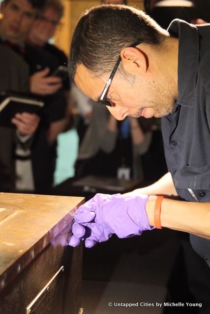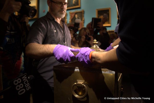 Equally historic was the showcase of a new batch of objects curated by New York high school students to be deposited this week into a time capsule to be opened in a century (see below for what went in). It took about five minutes to unscrew the bolts all around the bronze capsule. Everything inside was wrapped in brown paper or placed in envelopes, labeled with the perfect cursive handwriting so prevalent in the previous centuries. While many of us wondered if there would be crazy contraptions or items that marked the popular cultural sentiment of the time period, speaker Nick Yablon warned us that the most common reaction at time capsule openings was disappointment.
