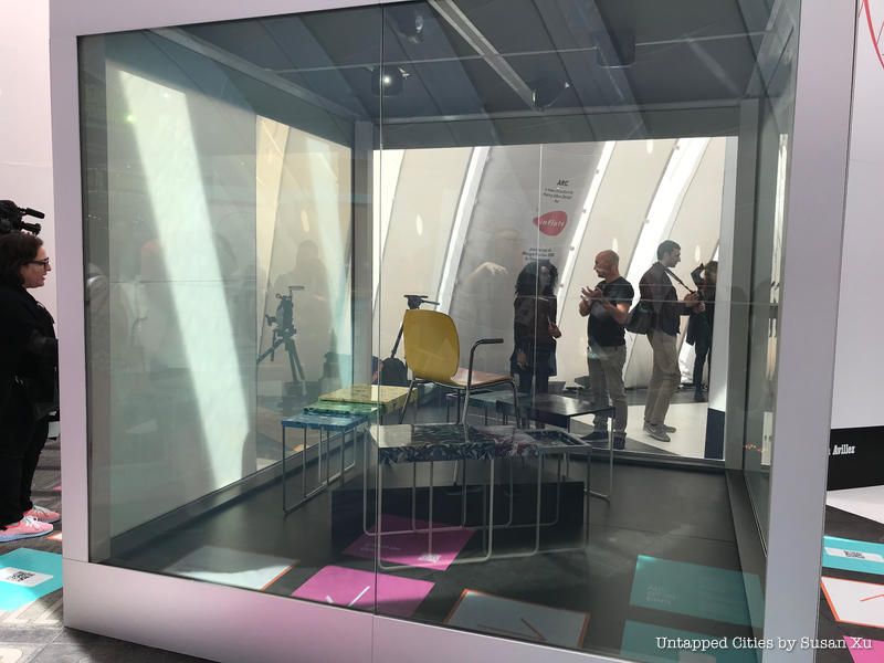 Outside of the hub, visitors are also invited to playfully interact with the architectural pavilions on the rest of the pedestrian plazas. This includes a showcase of chairs from MAGIS with HERMAN MILLER, for which design students were asked to develop 2D artwork as backdrops; Pratt Institute’s The Future of Take-Out, an exhibition of student solutions that focus on reducing waste; MIO’s new line of modern and sustainable furniture designed to enhance creativity; and zU-studio’s anti-gravity seating.