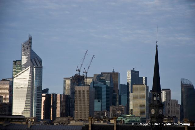 This skyline, which may be reminiscent of London perhaps or a Midwest city in the United States is in fact Paris! This is the La Defénse business district, developed beginning in 1958, and gradually displaced the farmland, factories and slums that once existed there. Today, it is home to Tour First, the tallest skyscraper in Paris, in view on the left of the photograph.