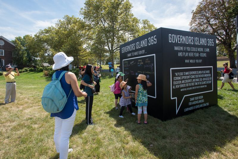 On Friday just before Labor Day weekend, the NYCEDC launched an interactive installation on Governors Island called #GovIsland365 that will solicit New Yorkers to give feedback on turning Governors Island into a year round destination. A cube designed by artist Amber Rae located at Soisson Landing where the ferry drops off features an interactive chalkboard. Visitors can write their ideas on what they’d like to see on Governors Island if it were open 365 days a year until September 25th and anyone can fill out the online survey though the end of September.